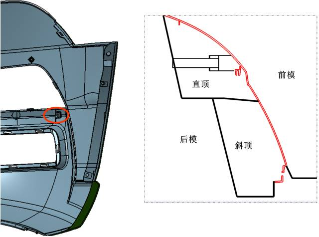 在汽车注塑模具中,针对汽车保险杠产品,模具设计时通常会采用先进的内分型面技术。其优点是分型夹线隐藏在保险杠的非外观面上,在汽车上装配后看不到外观夹线,不会影响产品外观。但这种技术在难度与结构上都要比外分型保险杠复杂,技术风险也较高,模具成本与模具价格也会高于外分型保险杠很多,但因外观美观,在中高档汽车中被广泛应用。