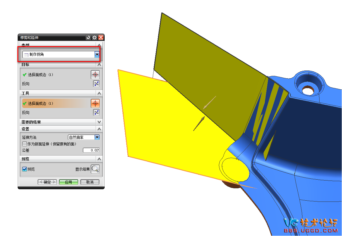 2.用“修剪和延伸”命令将两个面创建拐角,注意类型选择制作拐角,结果如图所示