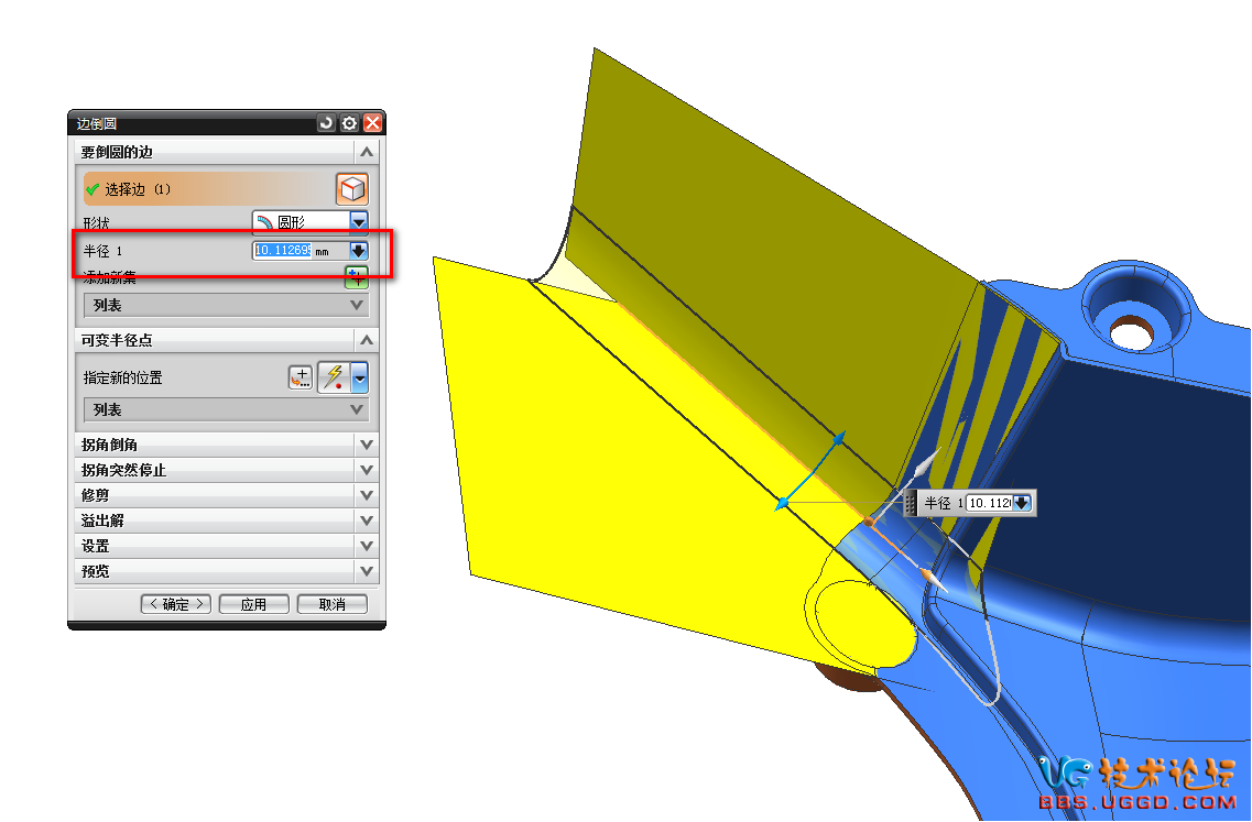 3.用“几何属性”命令测量两个面之间的R角是多少,并且将R角的数据复制下来,然后用“边倒圆”命令将R角倒上,粘贴R角的数据到半径1对话框中,确定